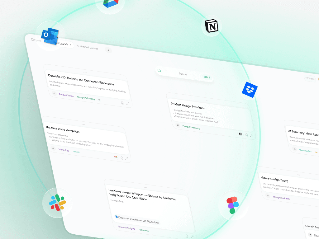 Constella 2.0 set out to fix these gaps and turn the product into a calmer, clearer, more connected thinking system. It introduced a lighter identity, a unified homepage for private and shared canvases, multiple canvases for different projects, tabs for quick switching, deeper integrations, and a mobile direction built around reachability and quick capture. Together, these changes created a platform that feels more structured, more scalable, and much easier to think inside.
