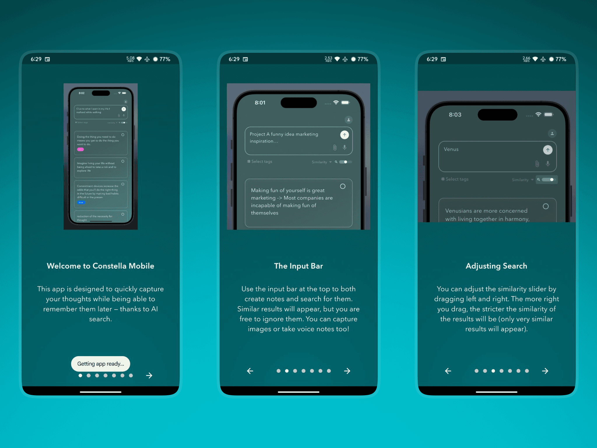 The original onboarding explained Constella through long paragraphs scattered across many screens. Users skipped most of it or left without understanding the basic concepts.